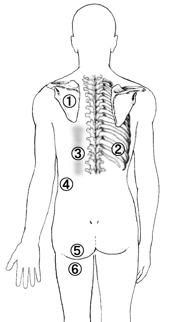 左の肩甲骨が右より高い位置にある(左の肩も上がって見える) A 背中の右の肋骨部分の一番下あたりに痛みがある B 左の起立筋が盛り上がっている C ウエストの左側のくびれ方が右より少ない D 左の尻が垂れている E 左足が細い |